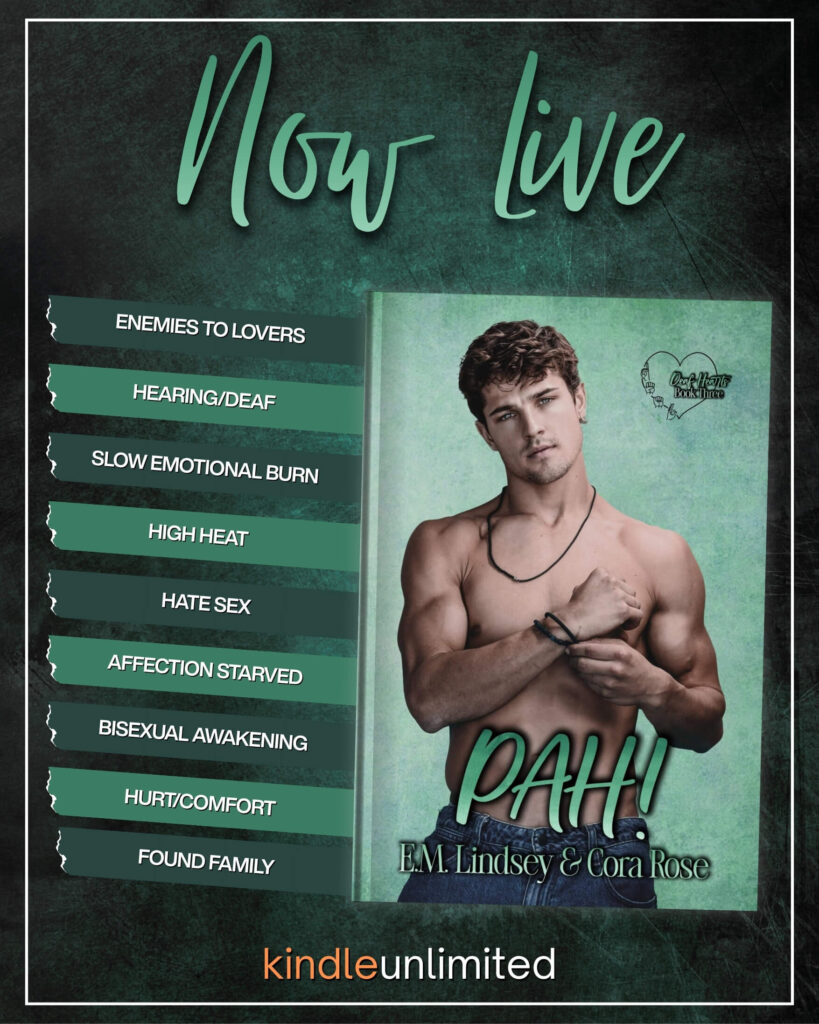 PAH! is the third book in the Deaf Hearts series and can be enjoyed as a stand-alone. It’s a spicy, MM, enemies to lovers rom-com featuring a burnt out, Deaf corporate cog with a country-sized chip on his shoulder, a hearing, sexy-sweet, gym owning himbo who is learning to take what he wants, especially when it’s offered, bad dates, better dates, A+ dates, light stalking, and a happily ever after.